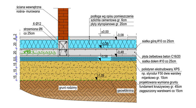 SCHEMAT PŁYTY FUNDAMENTOWEJ – ŚCIANA WEWN. NOŚNA – DOM MUROWANY